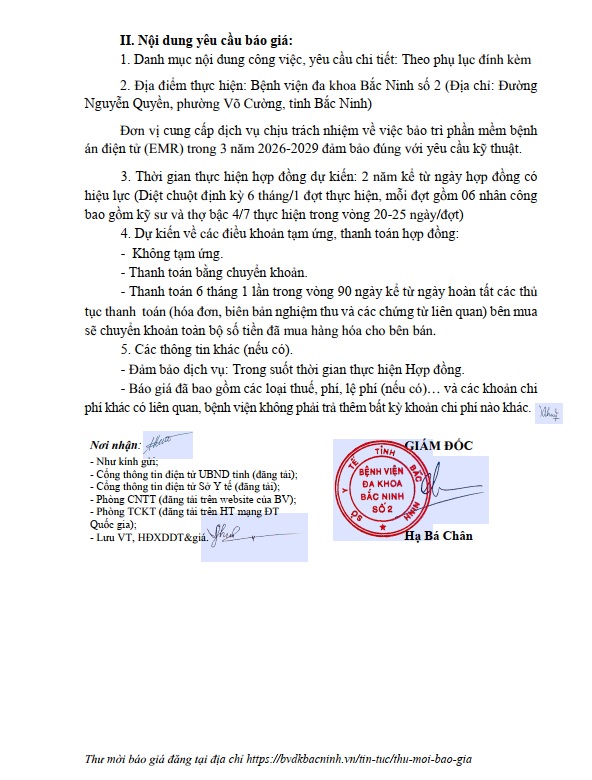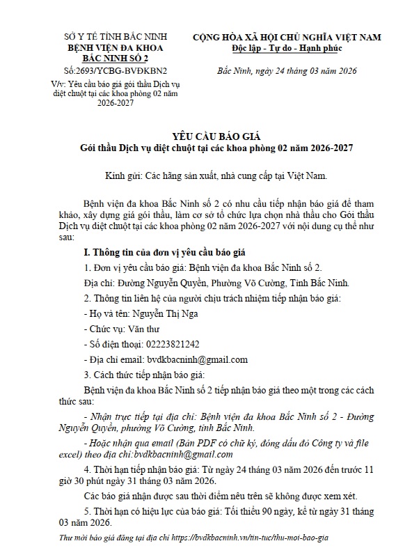 Yêu cầu báo giá gói thầu Dịch vụ diệt chuột tại các khoa phòng 02 năm 2026-2027