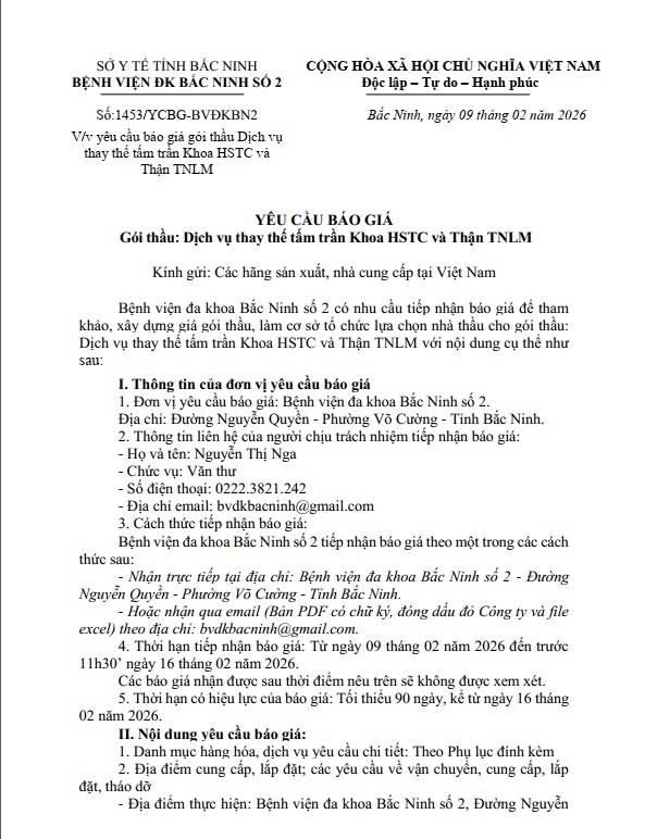 Yêu cầu báo giá gói thầu Dịch vụ thay thế tấm trần Khoa HSTC và Thận TNLM