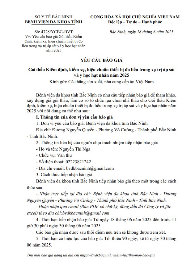 Yêu cầu báo giá Gói thầu Kiểm định, kiểm xạ, hiệu chuẩn thiết bị do liều trong xạ trị áp sát và y học hạt nhân năm 2025