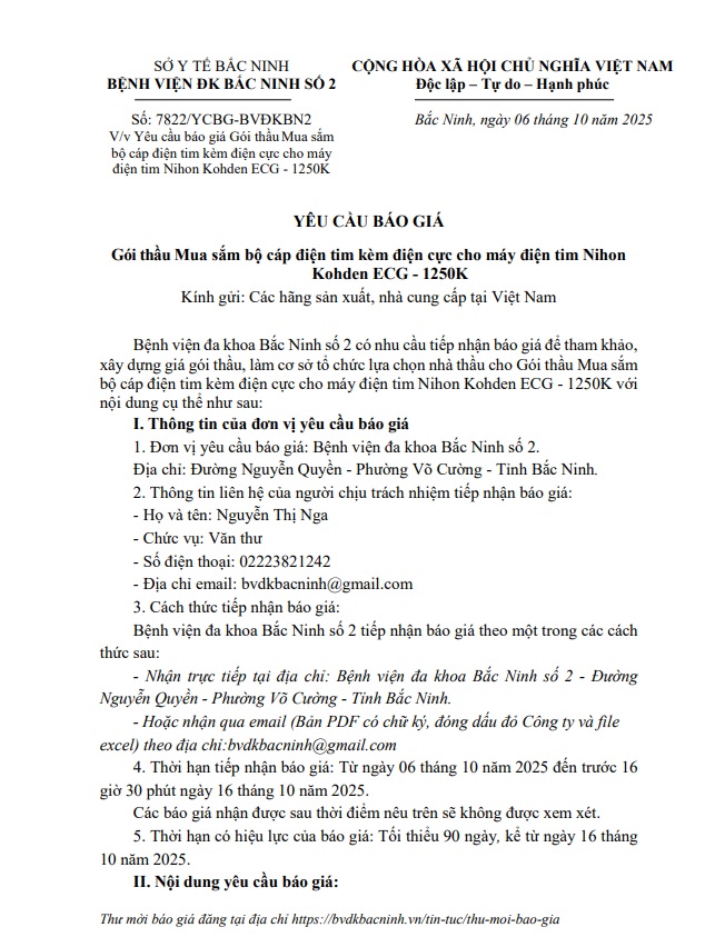 Yêu cầu báo giá Gói thầu Mua sắm bộ cáp điện tim kèm điện cực cho máy điện tim Nihon Kohden ECG - 1250K