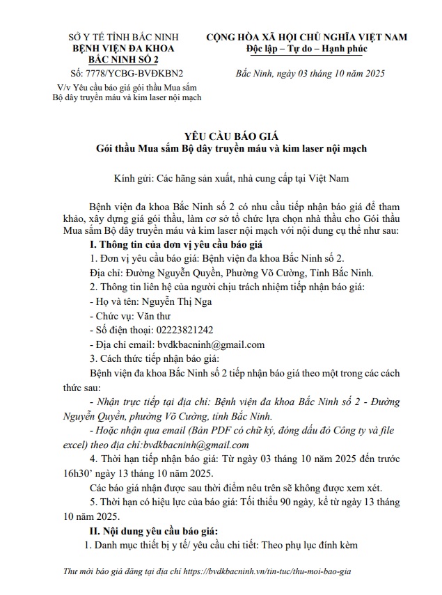 Yêu cầu báo giá gói thầu Mua sắm Bộ dây truyền máu và kim laser nội mạch