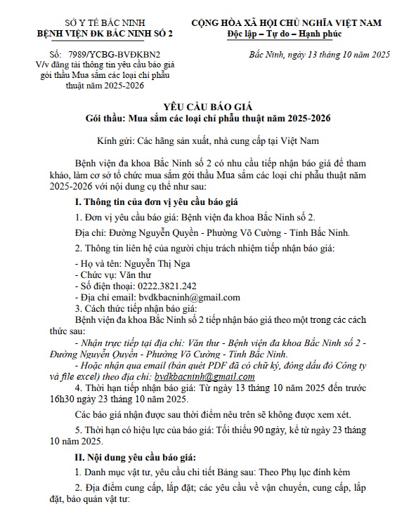 Yêu cầu báo giá Gói thầu: Mua sắm các loại chỉ phẫu thuật năm 2025-2026