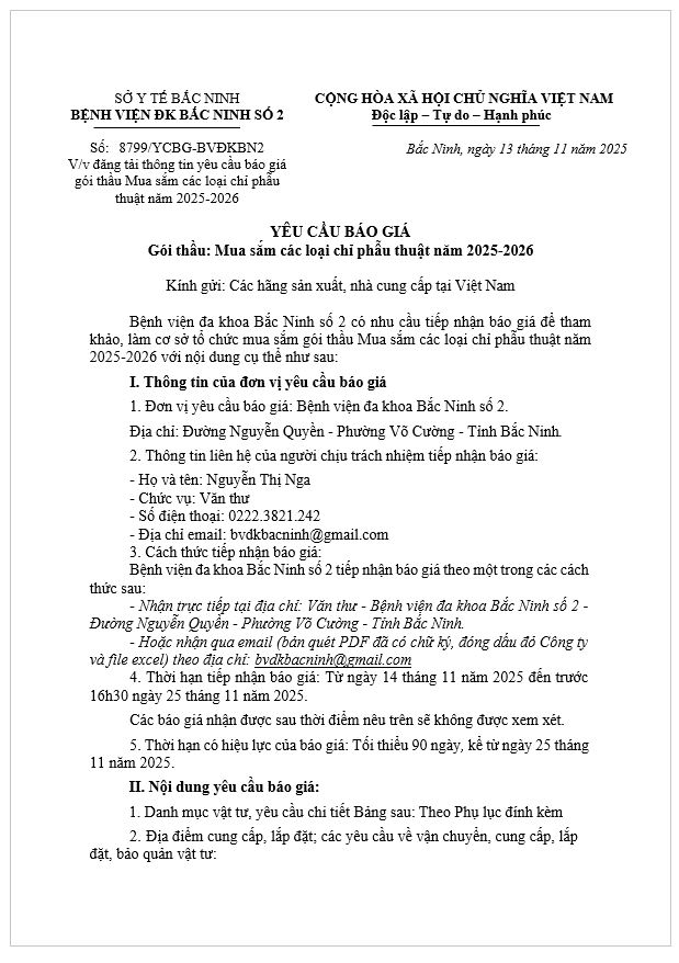 Yêu cầu báo giá gói thầu Mua sắm các loại chỉ phẫu thuật năm 2025-2026