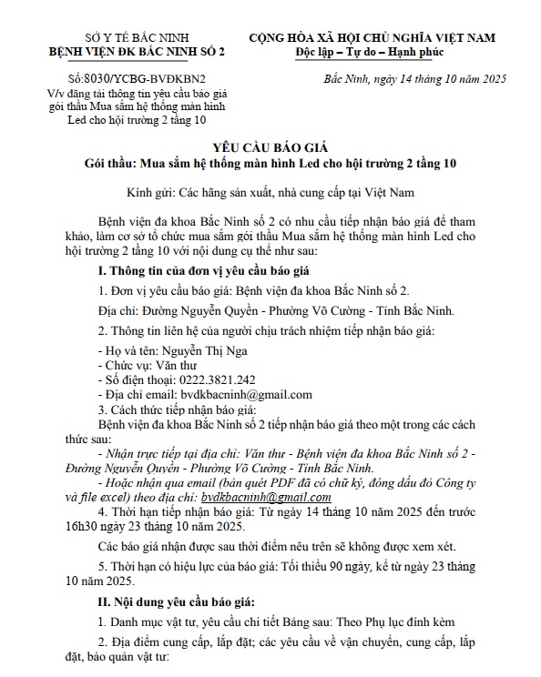 Yêu cầu báo giá gói thầu Mua sắm hệ thống màn hình Led cho hội trường 2 tầng 10