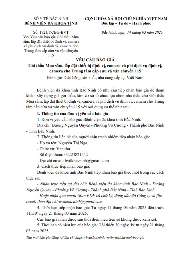 Yêu cầu báo giá Gói thầu Mua sắm, lắp đặt thiết bị định vị, camera và phí dịch vụ định vị, camera cho Trung tâm cấp cứu và vận chuyển 115