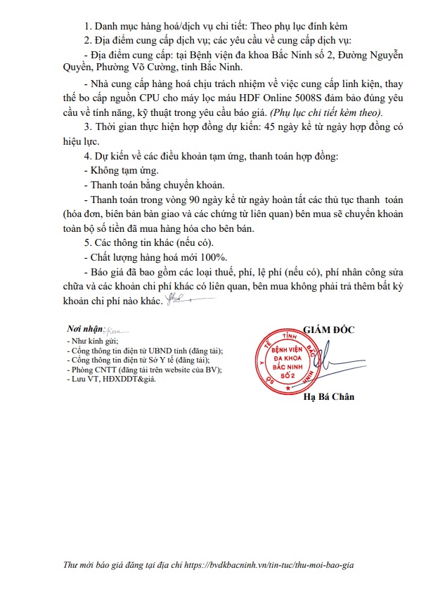 Yêu cầu báo giá Gói thầu Mua sắm linh kiện, thay thế bo cấp nguồn CPU cho máy lọc máu HDF Online 5008S