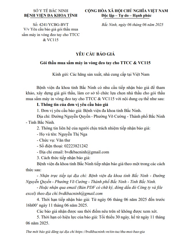 Yêu cầu báo giá gói thầu mua sắm máy in vòng đeo tay cho TTCC&VC115