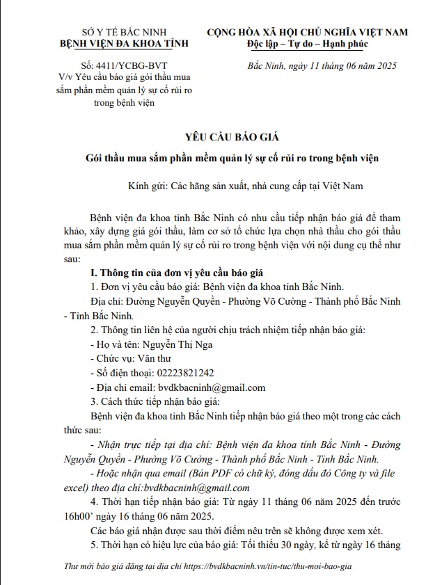 Yêu cầu báo giá gói thầu mua sắm phần mềm quản lý sự cố rủi ro trong Bệnh viện