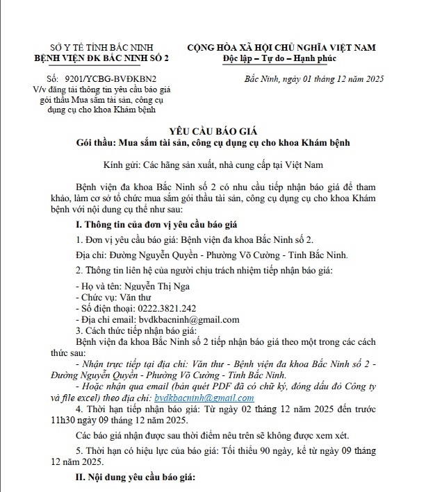 Yêu cầu báo giá gói thầu Mua sắm tài sản, công cụ dụng cụ cho khoa Khám bệnh