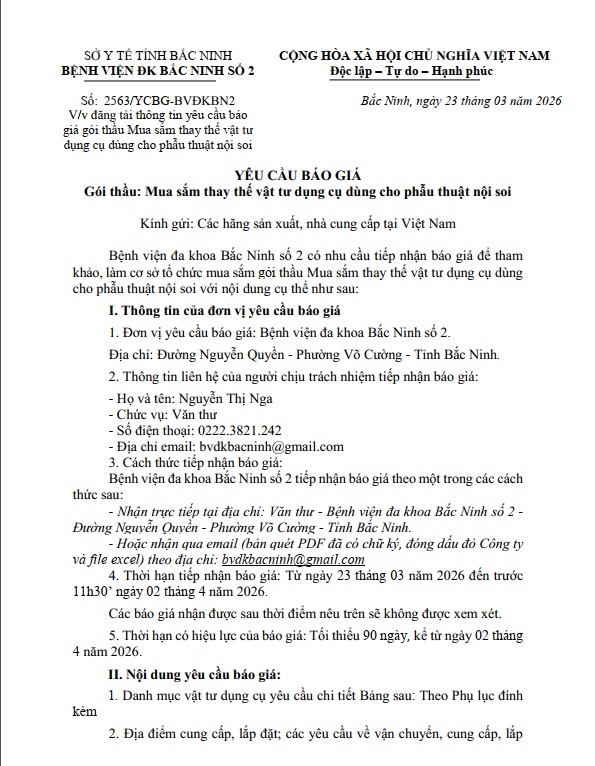 Yêu cầu báo giá gói thầu Thuê dịch vụ tư vấn xây dựng Hồ sơ thuyết minh An toàn thông tin mạng theo cấp độ cho hệ thống mạng, hệ thống thông tin của Bệnh viện đa khoa Bắc Ninh số 2
