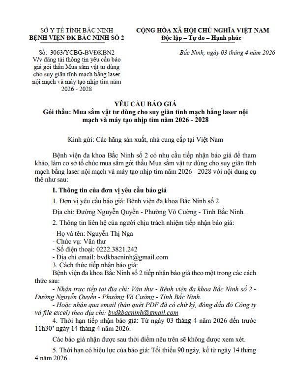 Yêu cầu báo giá gói thầu Mua sắm vật tư dùng cho suy giãn tĩnh mạch bằng laser nội mạch và máy tạo nhịp tim năm 2026 - 2028