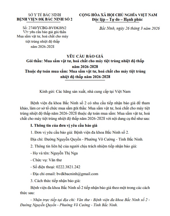Yêu cầu báo giá gói thầu Mua sắm vật tư, hoá chất cho máy tiệt trùng nhiệt độ thấp năm 2026-2028