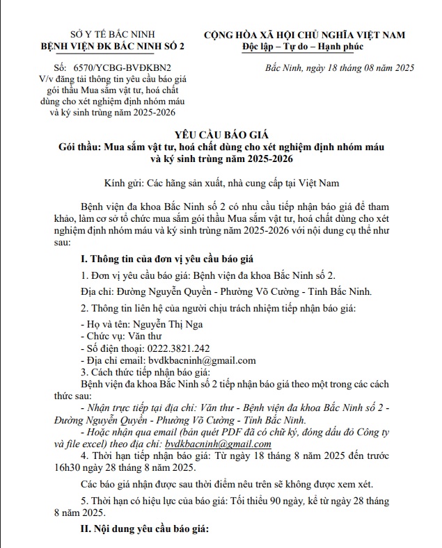 Yêu cầu cung cấp báo giá gói thầu: Mua sắm thuốc generic tại Bệnh viện đa khoa Bắc Ninh số 2 năm 2025 (Lần 7)