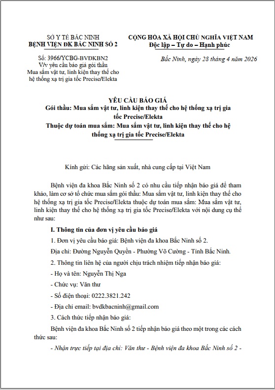 Yêu cầu báo giá gói thầu Mua sắm vật tư, linh kiện thay thế cho hệ thống xạ trị gia tốc Precise/Elekta