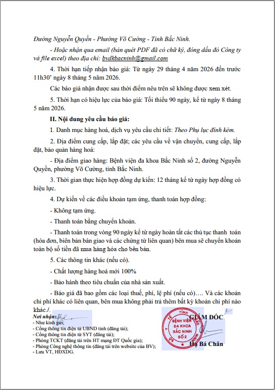 Yêu cầu báo giá Thẩm định giá “Khai thác tài sản công phục vụ hoạt động phụ trợ, hỗ trợ trực tiếp: Dịch vụ trông giữ xe tại Bệnh viện đa khoa Bắc Ninh số 2”