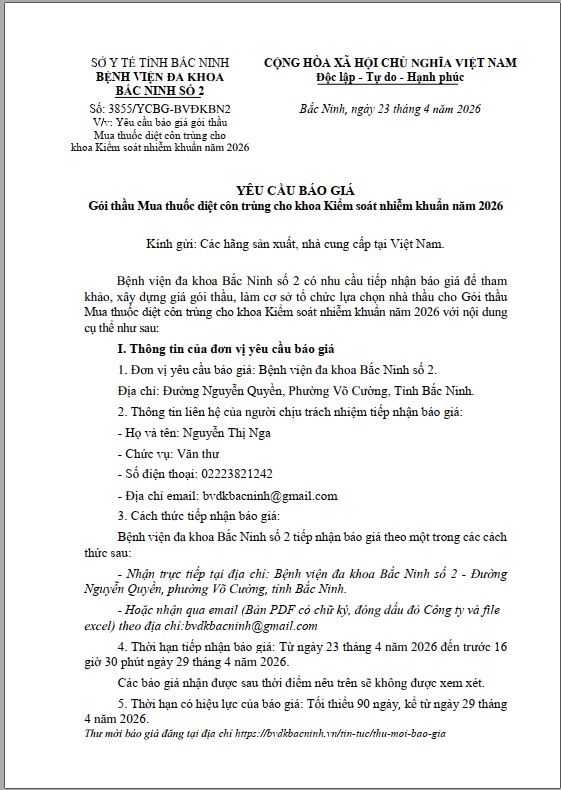 Yêu cầu báo giá gói thầu Mua thuốc diệt côn trùng cho khoa Kiểm soát nhiễm khuẩn năm 2026
