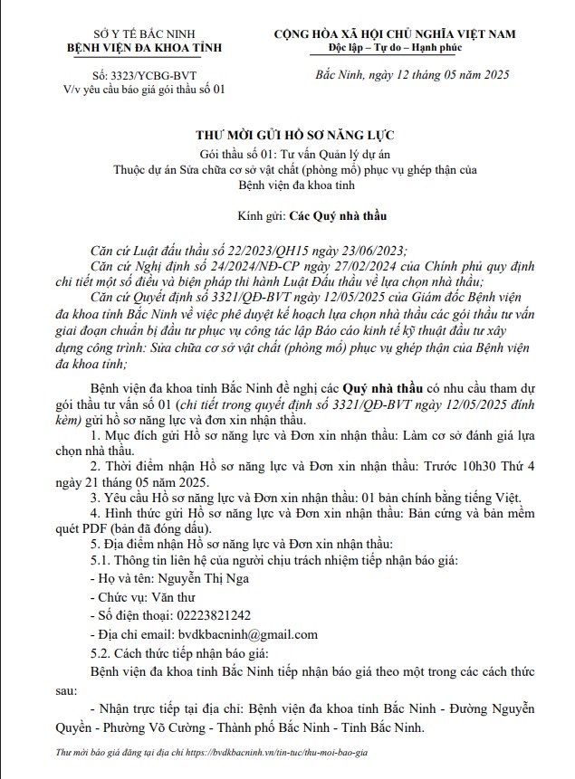 Yêu cầu báo giá gói thầu số 01: Tư vấn Quản lý dự án Thuộc dự án Sửa chữa cơ sở vật chất ( Phòng mổ) phục vụ ghép thận của Bệnh viện đa khoa tỉnh