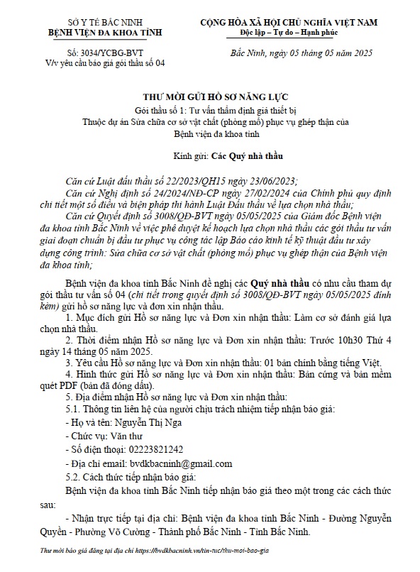 Yêu cầu báo giá gói thầu số 04: Tư vấn thẩm định giá thiết bị Thuộc dự ám Sửa chữa cơ sở vật chất (phòng mổ) phục vụ ghép thận của Bệnh viện đa khoa tỉnh