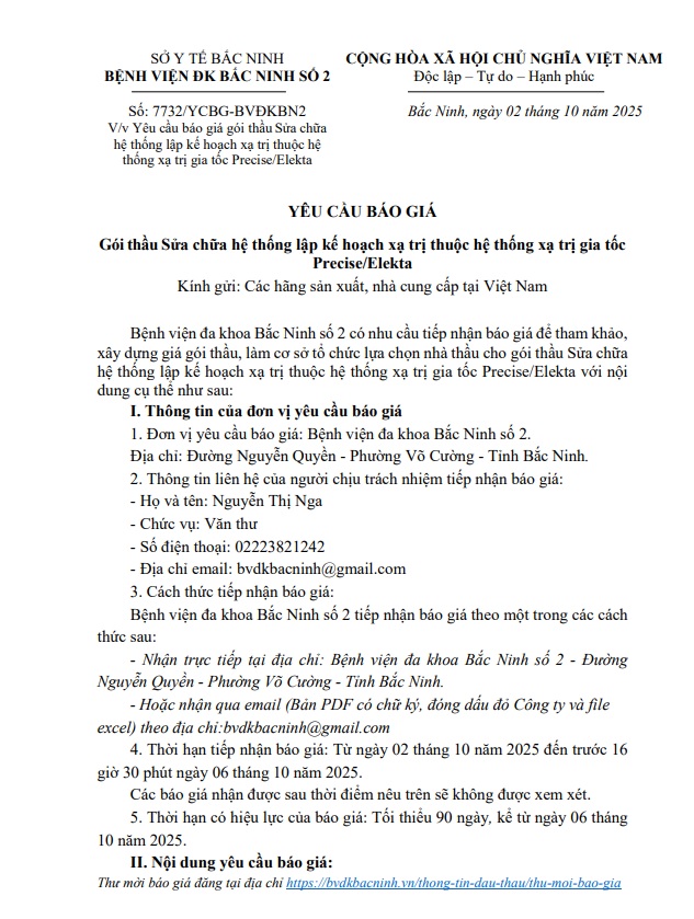 Yêu cầu báo giá gói thầu Sửa chữa hệ thống lập kế hoạch xạ trị thuộc hệ thống xạ trị gia tốc Precise/Elekta
