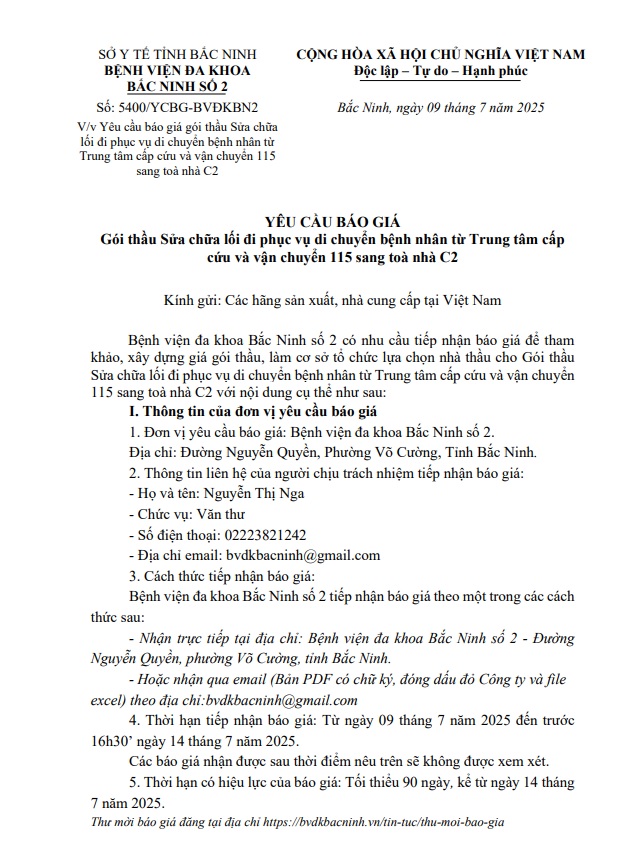 Yêu cầu báo giá gói thầu Sửa chữa lối đi phục vụ di chuyển bệnh nhân từ Trung tâm cấp cứu và vận chuyển 115 sang toà nhà C2