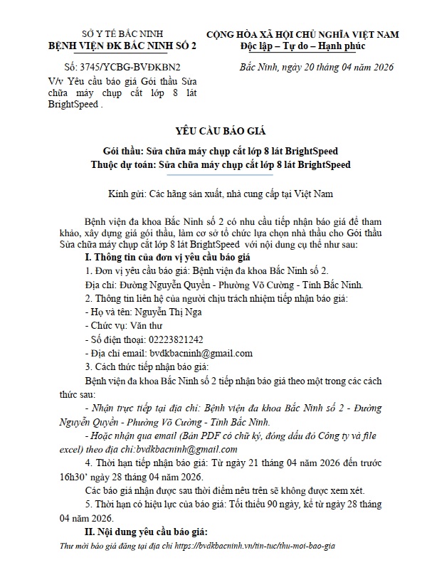 Yêu cầu báo giá Gói thầu Sửa chữa máy chụp cắt lớp 8 lát BrightSpeed