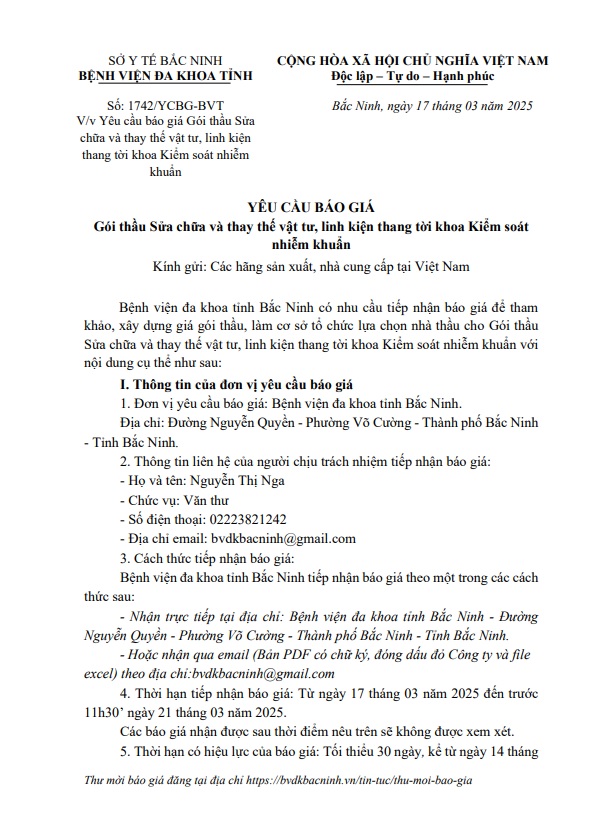 Yêu cầu báo giá Gói thầu Sửa chữa và thay thế vật tư, linh kiện thang tời khoa Kiểm soát nhiễm khuẩn