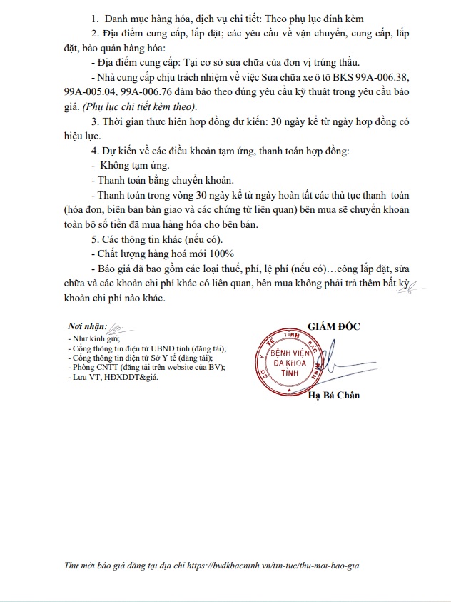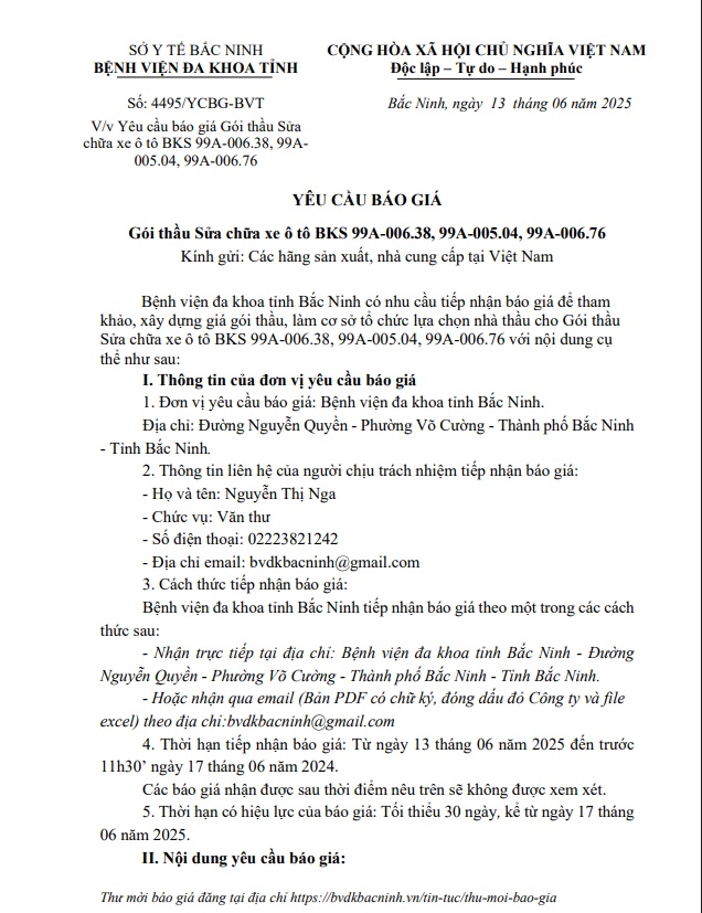 Yêu cầu báo giá Gói thầu Sửa chữa xe ô tô BKS 99A-006.38, 99A-005.04, 99A-006.76