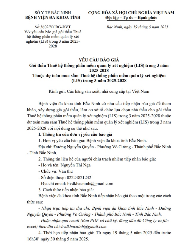 Yêu cầu báo giá gói thầu Thuê hệ thống phần mềm quản lý xét nghiệm (LIS) trong 3 năm 2025-2028