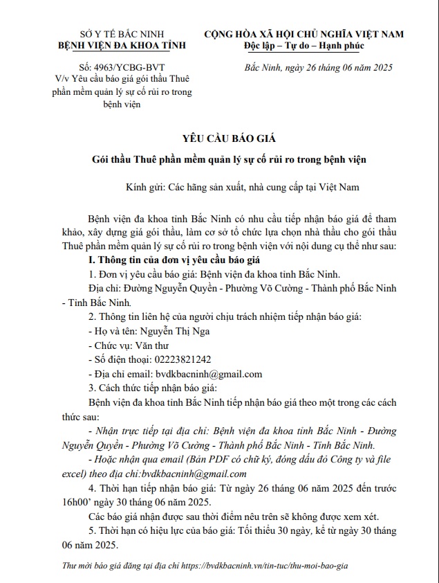 Yêu cầu báo giá gói thầu Thuê phần mềm quản lý sự cố rủi ro trong bệnh viện