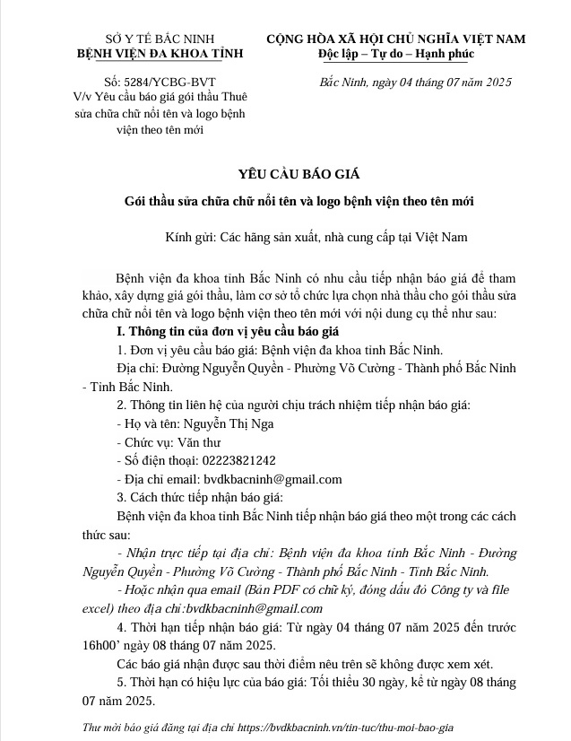 Yêu cầu báo giá gói thầu Thuê sửa chữa chữ nổi tên và logo Bệnh viện theo tên mới
