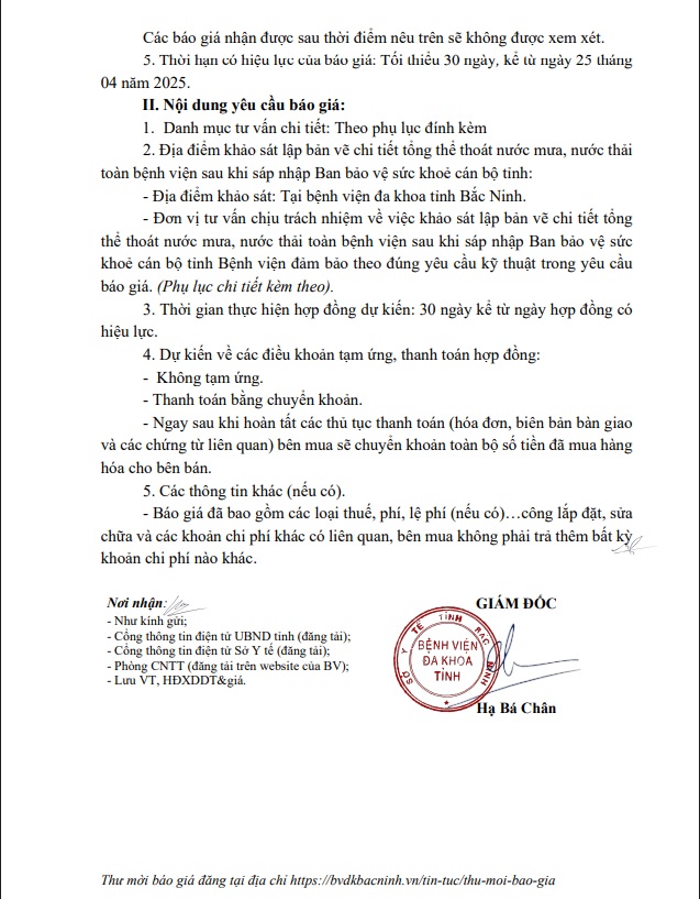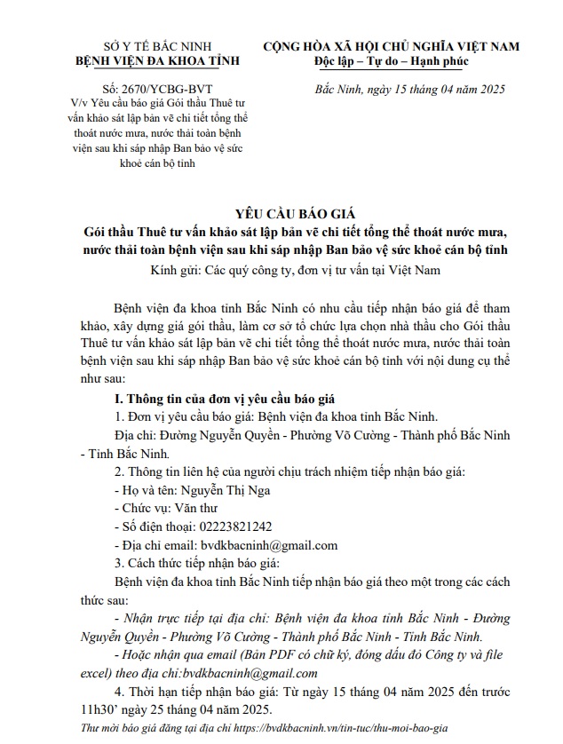 Yêu cầu báo giá Gói thầu Thuê tư vấn khảo sát lập bản vẽ chi tiết tổng thể thoát nước mưa, nước thải toàn bệnh viện sau khi sáp nhập Ban bảo vệ sức khoẻ cán bộ tỉnh