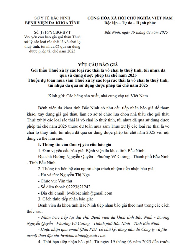 Yêu cầu báo giá gói thầu Thuê xử lý các loại rác thải là vỏ chai lọ thuỷ tinh, túi nhựa đã qua sử dụng được phép tái chế năm 2025