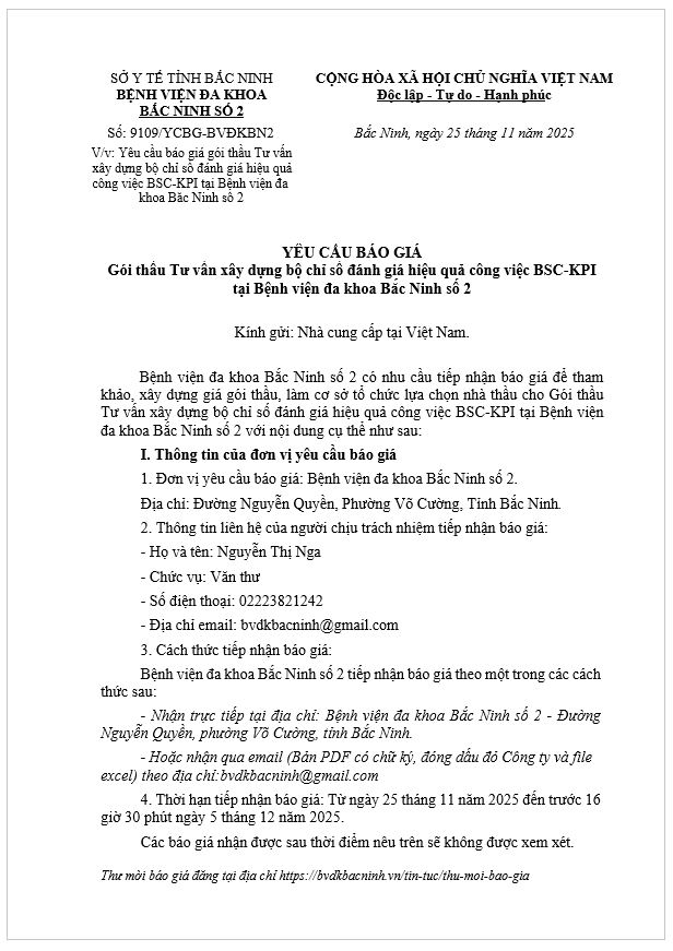 Yêu cầu báo giá gói thầu Tư vấn xây dựng bộ chỉ số đánh giá hiệu quả công việc BSC-KPI tại Bệnh viện đa khoa Bắc Ninh số 2
