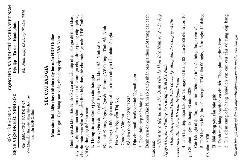 Yêu cầu cung cấp báo giá gói thầu: Mua sắm thuốc generic tại Bệnh viện đa khoa Bắc Ninh số 2 năm 2025 (Lần 6)