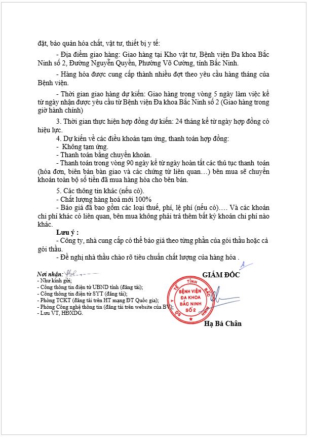 Công văn gia hạn yêu cầu báo giá gói thầu Mua tủ bảo quản