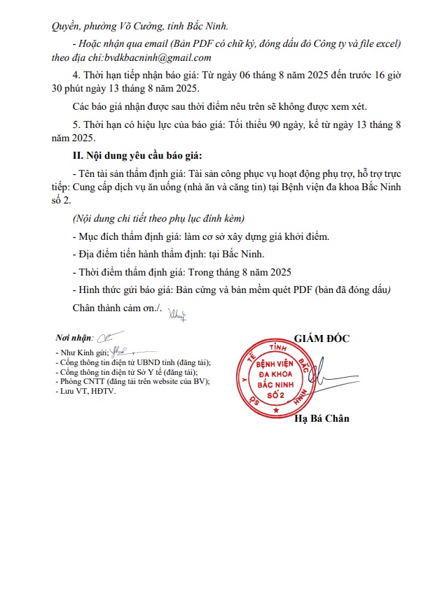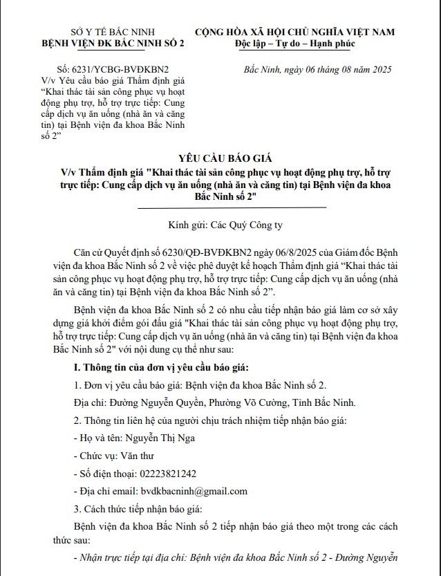 Yêu cầu báo giá Thẩm định giá “Khai thác tài sản công phục vụ hoạt động phụ trợ, hỗ trợ trực tiếp: Cung cấp dịch vụ ăn uống (nhà ăn và căng tin) tại Bệnh viện đa khoa Bắc Ninh số 2”