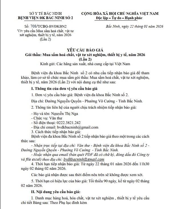 Yêu cầu Mua sắm hoá chất, vật tư xét nghiệm, thiết bị y tế, năm 2026 (Lần 2)