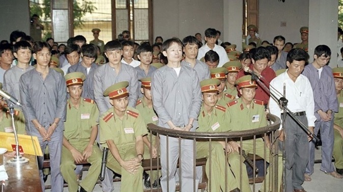 Tháng 5/1996, Cục Cảnh sát hình sự (Bộ Công an) lập chuyên án mang bí số K596, quét sạch băng nhóm tội phạm có tổ chức do Dương Văn Khánh (tức Khánh trắng) cầm đầu về các tội cưỡng đoạt tài sản, thu tiền bảo kê tại chợ Long Biên (quận Ba Đình, Hà Nội). Trong ảnh: Bị cáo Dương Văn Khánh và 23 bị cáo đứng trước vành móng ngựa tại phiên tòa xét xử (ngày 5/9/1997).