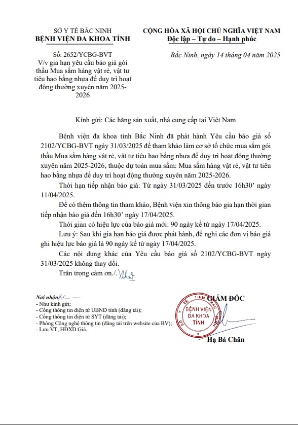 Gia hạn yêu cầu báo giá gói thầu Mua sắm hàng vật rẻ, vật tư tiêu hao bằng nhựa, để duy trì hoạt động thường xuyên năm 2025-2026
