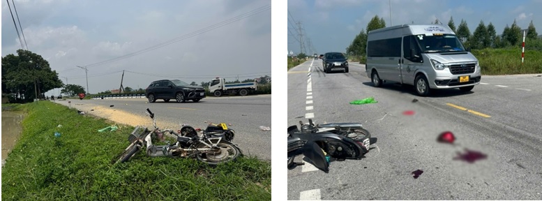 - Sáng 10/8/2025, tại ngã ba Hồng Giang, phường Cảnh Thụy bà Nguyễn Thị T (69 tuổi) đi xe đạp về nhà, khi đến gần ngã ba bà chuyển hướng đã bị xe mô tô đi cùng chiều từ phía sau va chạm, dẫn đến bà bị thương nặng và tử vong.