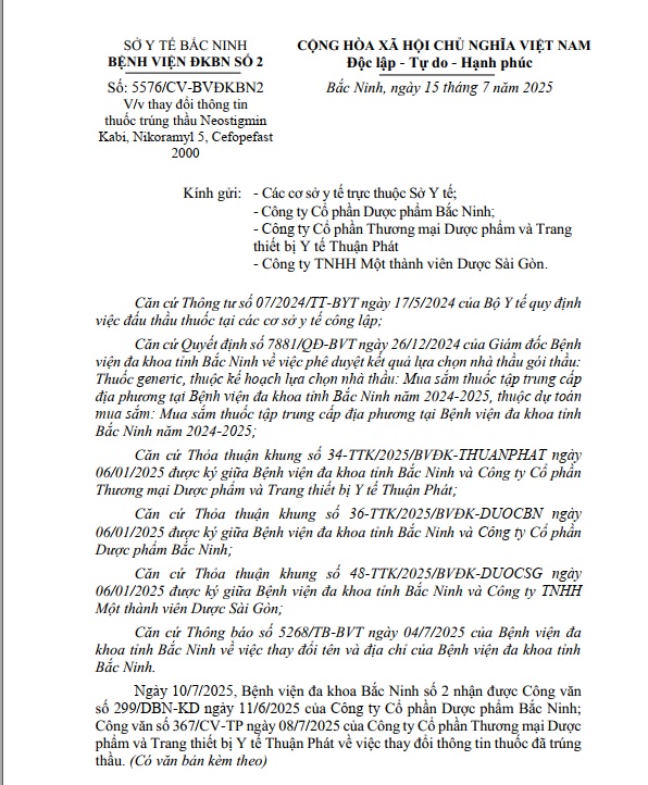 Thay đổi thông tin thuốc trúng thầu Neostigmin kabi, Nikorramyl 5, Cefopeffast 2000