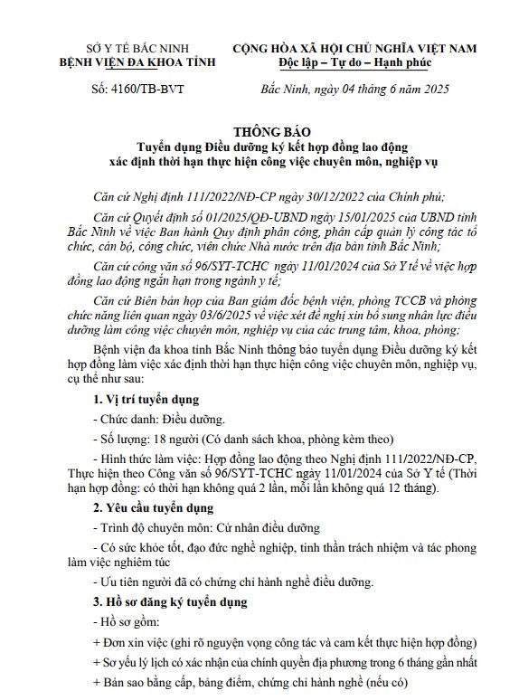 THÔNG BÁO TUYỂN DỤNG ĐIỀU DƯỠNG KÝ KẾT HỢP ĐỒNG LAO ĐỘNG XÁC ĐỊNH THỜI HẠN THỰC HIỆN CÔNG VIỆC CHUYÊN MÔN, NGHIỆP VỤ