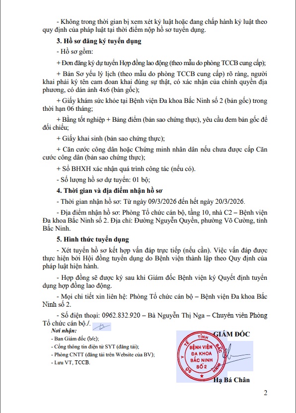 THÔNG BÁO TUYỂN DỤNG LAO ĐỘNG HỢP ĐỒNG XÁC ĐỊNH THỜI HẠN THỰC HIỆN CÔNG VIỆC CHUYÊN MÔN, NGHIỆP VỤ TẠI BỆNH VIỆN ĐA KHOA BẮC NINH SỐ 2 ( ĐỢT 2)