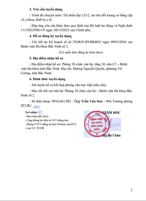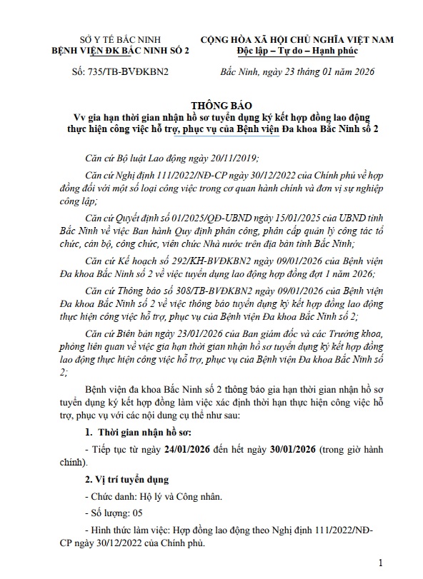 THÔNG BÁO VỀ VIỆC GIA HẠN THỜI GIAN NHẬN HỒ SƠ TUYỂN DỤNG KÝ KẾT HỢP ĐỒNG LAO ĐỘNG THỰC HIỆN CÔNG VIỆC HỖ TRỢ, PHỤC VỤ CỦA BỆNH VIỆN ĐA KHOA BẮC NINH SỐ 2