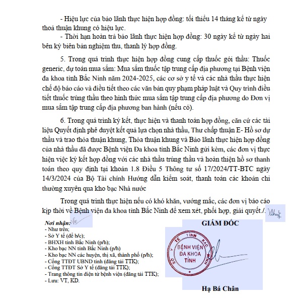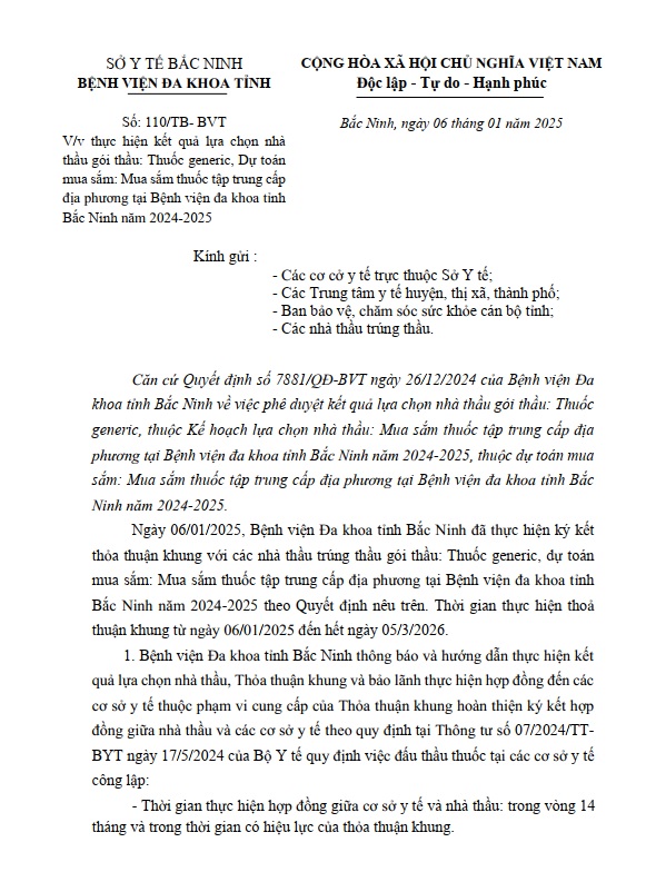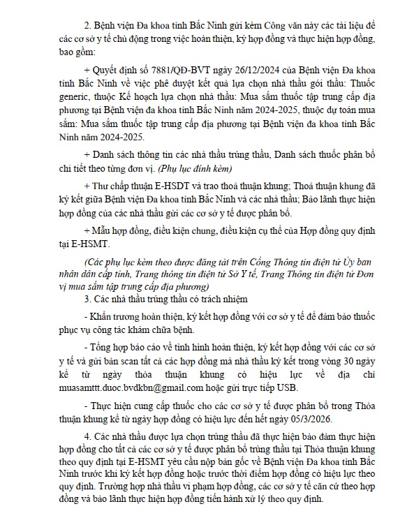 Thực hiện kết quả lụa chọn nhà thầu gói thầu: Thuốc generic, Dự toán mua sắm: Mua sắm thuốc tập trung cấp địa phương tại Bệnh viện đa khoa tỉnh Bắc Ninh năm 2024-2025