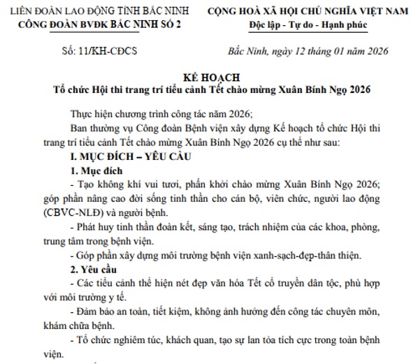 Công đoàn Bệnh viện Đa khoa Bắc Ninh số 2 kêu gọi sự hưởng ứng tích cực của các khoa, phòng, trung tâm nhằm triển khai Hội thi hiệu quả, thiết thực, trở thành điểm nhấn ý nghĩa trong dịp Xuân Bính Ngọ 2026./.