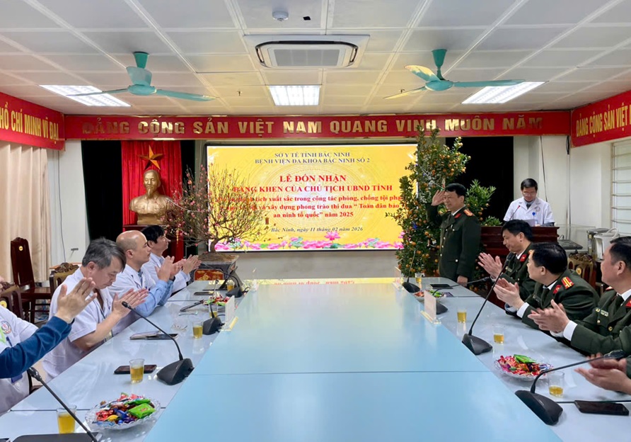 Trong không khí trang trọng và phấn khởi, sáng ngày 11/02/2026, Bệnh viện Đa khoa Bắc Ninh số 2 long trọng tổ chức Lễ đón nhận Bằng khen của Chủ tịch UBND tỉnh Bắc Ninh trao tặng cho tập thể Bệnh viện vì đã có thành tích xuất sắc trong công tác phòng, chống tội phạm, tệ nạn xã hội và xây dựng phong trào “Toàn dân bảo vệ an ninh Tổ quốc” năm 2025.