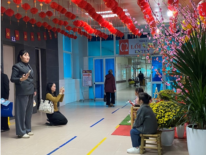 Tại các khoa, phòng, hơn 40 tiểu cảnh và không gian Tết được trang trí, sắp đặt tại các khu vực công cộng, hành lang và sảnh chờ. Những cành đào, chậu quất, câu đối đỏ, góc xuân rực rỡ sắc màu đã mang không khí Tết cổ truyền đến gần hơn với người bệnh và người nhà. Trong không gian ấm áp ấy, nụ cười, lời chúc đầu Xuân và sự sẻ chia đã phần nào xoa dịu nỗi nhớ nhà, giúp mỗi người bệnh cảm nhận rằng, dù ở bất cứ đâu, Tết vẫn đủ đầy yêu thương.