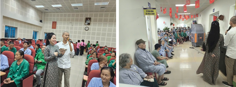 Mở màn là tiếng hát của Bình Phượng và Minh Thu - Hai nghệ sĩ nhiều năm dành thời gian cho các chương trình thiện nguyện của bệnh viện. Từng giai điệu ngân lên, lời ca ngọt và những khoảng giao lưu mộc mạc như chuyền tay nhau hơi ấm, khiến nụ cười nở trên gương mặt các cụ, các bác.