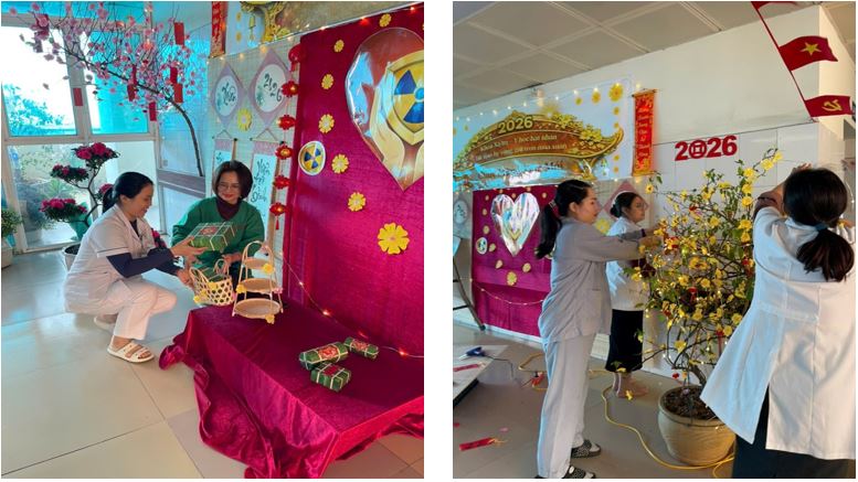 Tiểu cảnh của khoa Xạ trị & Y học hạt nhân không chỉ tái hiện không gian Tết cổ truyền với bánh chưng xanh, cành đào hồng, câu đối đỏ, mà còn gửi gắm một điều giản dị: giữa hành trình điều trị còn nhiều thử thách, niềm tin vẫn được nâng đỡ mỗi ngày bằng sự đồng hành tận tâm và những phương pháp điều trị hiện đại.